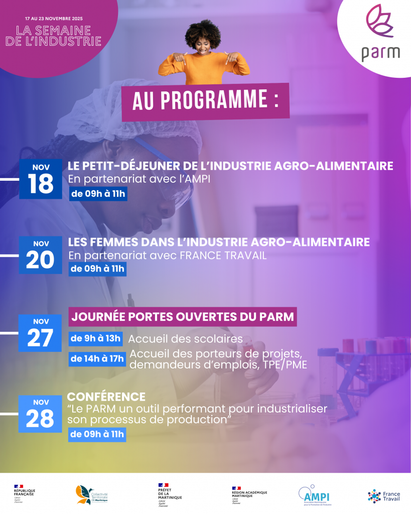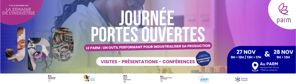 À l’occasion de la Semaine de l’Industrie, le PARM invite les scolaires, les professionnels, les entreprises (TPE/PME), les porteurs de projet, les demandeurs d’emplois et institutions à découvrir ses missions, ses compétences et expertises ainsi que ses installations, lors de plusieurs événements phares entre le 18 et le 28 novembre 2025.